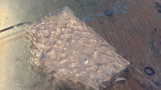 The ice is rippled and smooth, with a character of colour that is quite remarkable. So deep and beautiful. I decided to use 3mm thick Perspex, the ice 'dimples' carved using a Dremel and then the sheet shaped with a heat gun. As ever, I'd never done this kind of thing before, so had no idea how it would turn out. I ended up getting very bored with doing the dimples (not a 1920's dance craze) and shaped the panel half way through the process.